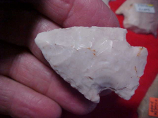 Crescent Quarry, high grade Burlington Chert that was heat treated--that 'ruddy' iron cast to the chert and the (now) heavy gloss, they both indicate a heat-treated Burlington. Length is 1&15/16" by 1&3/8"--at 3/8" max thickness it'd indicate a much larger blade as first made, narrowed and shortened as needed to keep a sharp edge. There is very slight wear on the very tip, but no other use-made damage--I'm assuming the two indentions on the basal edge were to better haft the piece, they were not damage. The knife head (or dart head) was made to fit the handle, not the other way around. Flaking, knapping, is excellent, as it overall patina--every detail guaranteed authentic. Shipping is $7.00 with checks or <.O.s welcomed. Sorry, I do not use paypal-type payment services--Roy A.