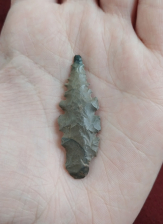 This patinated Burlington Ross Blade has good length and form. It was found in St. Louis Co., Missouri and comes with a Dwain Rogers COA. Ross blades were thought to be ceremonial and usually have an expanded, rounded base.