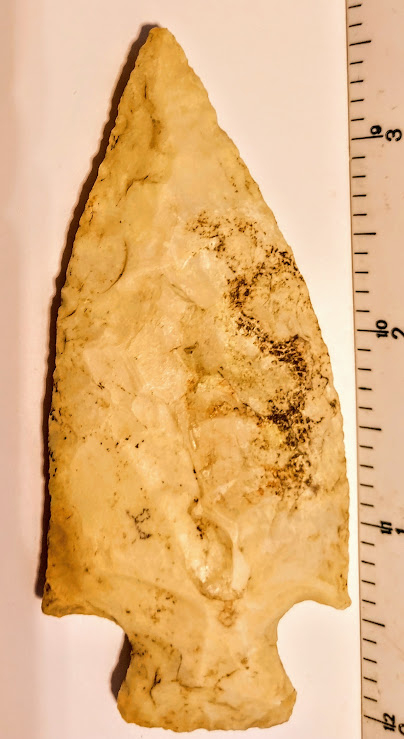 This large Kings Point is an excellent example of its type. This Late Archaic point is also known as a Patterson Springs Corner Notch point. It was found in Jackson Co., Missouri, and comes with a Dwain Rogers COA.
