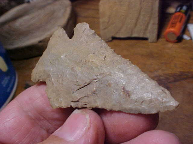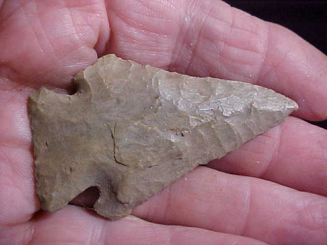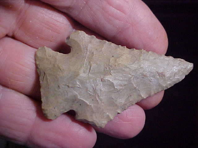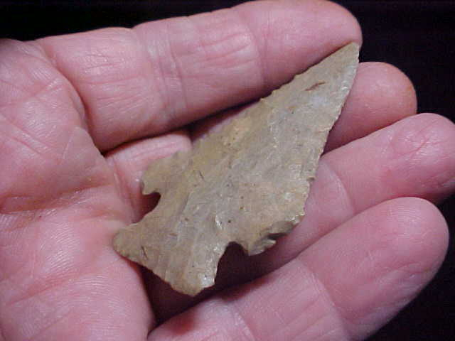A not-half-shabby creek find from the Union--Webster County, Kentucky, creeks--a Pinetree (or Pinetree Cornernotched, if you prefer) measuring 2&1/2" by 1&7/16"--very slightly under 5/16" as the single thickest spot, with an extra thin blade on the top 1&1/2"--serrated, naturally. The basal edge shows decent grinding. The flint can be termed either a 'generic' Hornstone, or a Hopkinsville Chert--there is just enough color inclusion that I'd label the piece Hopkinsville as it's often hard to distinguish the two flints. One barb--the longer one--has a very slight ding at the end, the other is sharpened and salvaged as the blade went through sharpen-and-use cycles. When the blade was last sharpened the knapper ground the snapped barb--you'll feel how it was polished, see the gloss from that salvage work. Every detail is guaranteed authentic, period. Shipping is $7.00, checks or M.O>s are how I accept payment. Sorry, that means this store doesn't use paypal-type payments--Roy A.