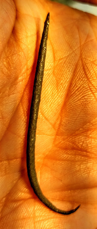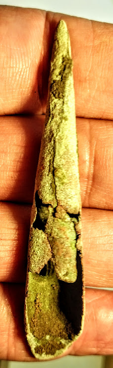 This is a great group of Old Copper Culture (OCC) artifacts that Native Americans shaped from native copper or "float copper" found on the Upper Peninsula of Michigan. This grouping includes a Crescent Knife, a fantastic fishhook, and three rolled projectile points. These artifacts were found in Delta Co., Michigan.