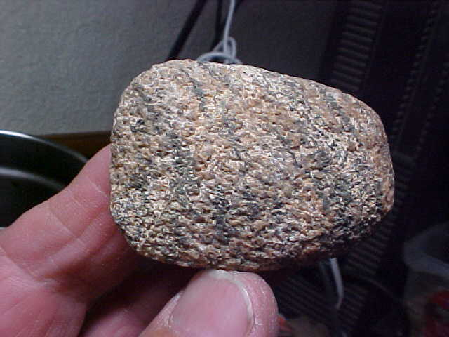 Sort of an orange/ rust colored granite Celt with green bandings, the small (1&15/16" by 1&3/8" by 3/4") thick Celt was found along the lower Wabash River--I'd assume the Indiana side of the stream, but the family could have just as easily boated to the Illinois side to hunt their favorite sites. The Woodland piece, likely Hopewell based on the percentage of Hopewell artifacts in their collection, has a grainy surface--well shaped to form, but definitely, VERY definitely not polished. Someone once told me that soil acidity can almost 'etch' granite--if so, that was an almost corrosive soil. The bit is well formed, but not a 'crisp' edge--maybe that was from heavy use, whatever a smaller size Celt was needed for. Neat, authentic piece. Shipping is $7.00, checks or M.O.s are welcomed, but paypal-type payments are not used on my store--Roy A.