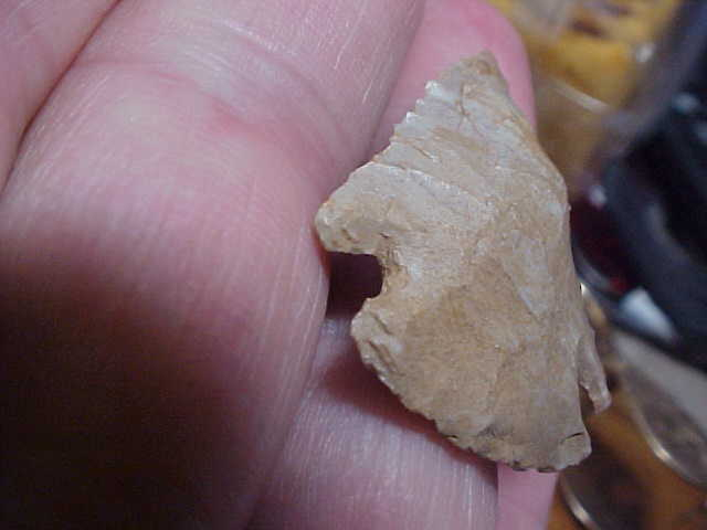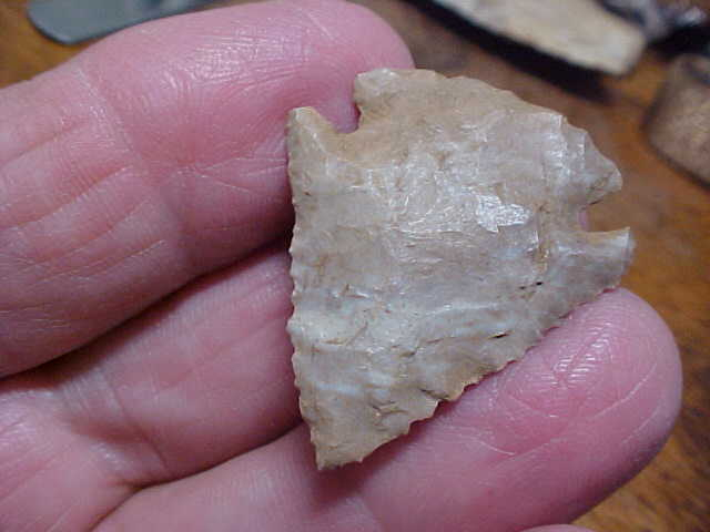 Shipping included with the cost on this S.W. Indiana either Pinetree or Kirk Cornernotch. Because there is no basal grinding I'm supposing the piece is a Kirk--but that's based on one detail--grinding. The rounded base style actually looks more Pinetree, as does the serration--very small pressure-made serration work. This was one 7500BP knapper with some skilled hands. Length of the Muldrough Flint cornernotch is 1&5/16" by 1&1/8". Both barbs are intact, what looks like a chip at the end of one barb is a band of light colored flint that angles out to the point of the barb--it took a 10x loop for me to be sure of that--one OTHER thing that 10x loop will show is mineral adhesions everywhere they should be--every detail guaranteed authentic. I welcome checks, I welcome money orders, but I do not use paypal-type payment services--Roy A.