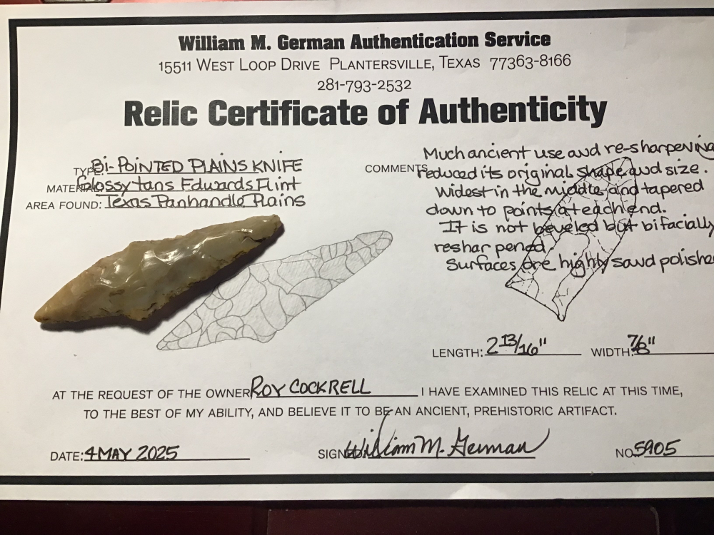 Plains Knife recovered In The Texas Panhandle. It is Bi-Pointed and shows ancient use and wear as well as river polish. I have the shipping and it cones with a Bill German coa.