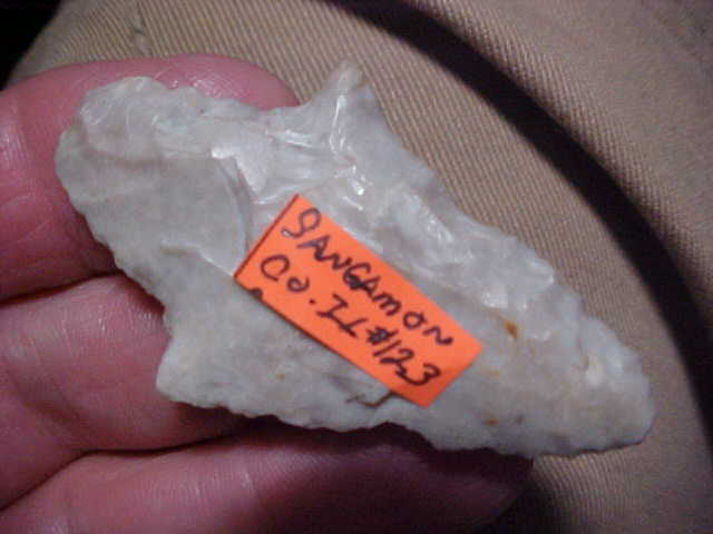A Sangamon County, Illinois, Dixon, a glossy Crescent Quarry Chert,2&1/4" by 1&5/16", only 1/4" MAX thickness. The blade shows a number of ancient sharpenings, but still a well made blade and great barbs. Note the stem is practically serrated--not by accident, some Woodland knapper wanted to make sure his handle bindings didn't slip--I've seen countless stemmed points, but never noticed a stem with "grip-tight" serrations. Makes sense. Great patina, but there is a small ding (use made) on the very tip. Guaranteed real, period. Shipping is $7.00, checks, cash, or M.O>s are welcomed, but I do not use paypal-type payment services--Roy A.