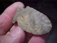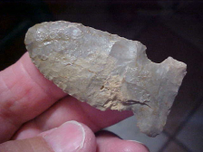 Great side notches on this Perry County, Indiana, Early Archaic Big Sandy--basal edge is ground, but not overly heavy, but what a fine side-notching job by the knapper. Length from the somewhat rounded tip to the base is 2&1/16" by 1", with a fraction over 1/4" the thickest measure. One shoulder looks like the hunter/ knapper was working around an inclusion of cortex in the flint--NOT broken, the knapper used what flint he had available in his preform. Nicely patinated, finer knapping in the tip area than you expect until you put it under a 10x loop. One face shows some glue from the way the finder displayed the point, but that'll be easily removed-you see the shine, you'll know what it is. Shipping is $7.00 (cost of a first class package anymore, unfortunately), and I welcome payments by check, cash, or M.O.. Sorry, I do not use paypal-type payment services--Roy A.