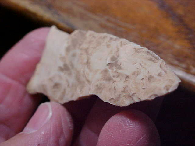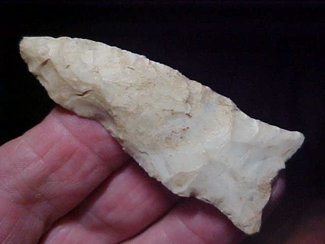 A western Illinois Dalton variety (Hemphill is my closest guesstimate) made from a patinated Burlington Chert--or Crescent quarry chert, 2&3/4" by 1&1/16", a decent, thin profile at only 5/16" thickness near the hafting area. The Dalton Culture knapper worked with a dish-in along one blade edge, the feel of use polish would indicate it was a shaft scraper. There is slight wear on the tip (use), and 'acceptable' stem edge grinding. The field dirt is still in place--you can see exactly what the Sangamon County, IL, finder saw (and left)--if you decide to wash the piece, that's up to you--for my collection, that extra bit of patina is just fine. Guaranteed real, period. Shipping is $7.00, checks or M.O>s are both welcomed. Sorry, I do not use paypal-type payments--Roy A.