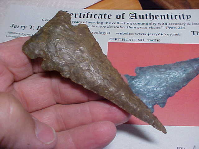 The 2011 Jerry Dickey COA calls the point a Thebes, but my 'take' is still Big Sandy Broadbase--opinions are just that. If you're the next owner you can decide what to call the Early Archaic point out of a creek in Daviess County, Kentucky. Jerry called the flint 'possibly hornstone'---could be hornstone or a high grade of Dover Flint (as I suspect)--4" by 1&5/8", max thickness in the hafting area is 5/16", and most of the blade is in the 1/4" +/- range--THIN. You can feel work polish on one side of the very narrow tip--there couldn't have been much pressure on the tip or it would have snapped, but the use was sufficient to leave the tip polished on one side. The base has super edge grinding--both Big Sandys and Thebes were known for their polishing of the basal edge. The price includes the shipping cost--COA shipped in an envelope so it doesn't get bent. I welcome checks or money orders, but do not use paypal-type payment services. One more small note: if you see the price, you know what it'll take to buy the point--Roy A.