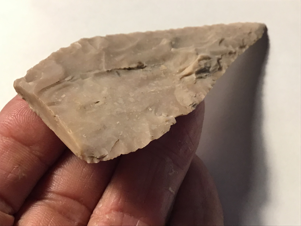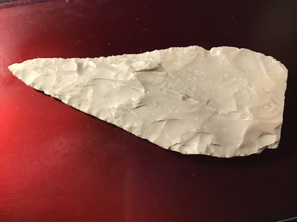 This is an exceptionally thin knife recovered in Comanche County. The base is anciently snapped, and well flaked with edges showing heavy use with mineral deposits. I have the shipping and will guarantee authenticity and satisfaction.