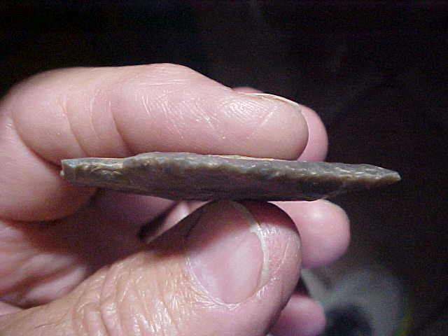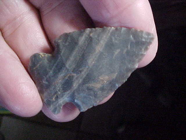 I pay the shipping on this striped flint 1&7/8" by 1&1/8" by 1/4" thick Knox County, Kentucky, point--studying the piece over-and-over, I keep coming back to Early Archaic (based on the exceptional knapping skill shown)--I lean toward either Kirk Cornernotch or Stilwell--two points that have been found on sites together. Too, the basal edge is not ground (to any GREAT measure--you definitely feel grinding in the center of the base) That upper blade, see the photos, that's some great pressure chipping. My original 'take' was based on the slightly rounded basal notches-more like Hopewell work, but the upper blade convinces me (finally) that the piece is indeed Early Archaic Culture--great patina, great flint, guaranteed authentic. I welcome checks, cash, or M.O.s, but do not use paypal--Roy A.