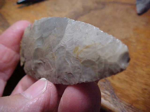My caliper reads on the 'low side' of 3&1/2", so close you see the bar measure almost touching 3.5"--that's a pretty good size Dove for Indiana Harrison County-type Hornstone. Width is 1&3/8", center of blade thickness is 3/8"--as the photos will show, there is very little bevel sharpening, the blade had not much usage (resharpening) after it was first a Cobbs Knife (preform for an early stage Dovetail). Basal grinding is excellent. A slight use-wear to the tip indicates the Early Archaic era user/ hunter was working the tip as a gouge--under magnification you can see wear polish--his work may have worn away an eighth inch of the length, hardly any more than that. I'm assuming this was a creek find based on the STRONG patination, Warrick County, Indiana--the finder, now deceased, can't tell me that, only the heavy mineralization can. To say it very simply: as long as I'm alive the piece is guaranteed authentic, it'll always be welcomed back in my collection. One note--the base shows a slight 'cleft' in the flint itself--the price reflects that 'fault line'. Shipping is $8.00, packed very, very securely. I welcome checks, I welcome money orders, but I do not use paypal-type payments--Roy A.